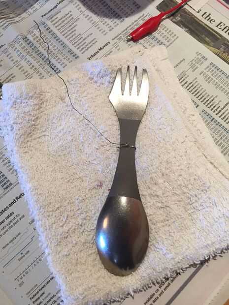 A continuación, envuelva el cable de titanio alrededor de su objeto un par de veces. Necesita el cable de titanio para ajustarse lo suficiente como para formar una sujeción segura en el spork y una sólida conexión eléctrica. Quiere suficiente cable izquierda sobre crear un "mango"