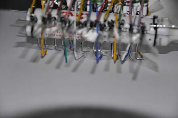 Para agregar eso barra de conexión, el gancho vertical se empujan alrededor de la parte doblada de la 'barra sobresale el marcador'. Luego el tubo es retirado un poco de su espiga, y el gancho horizontal es empujado alrededor del tubo.