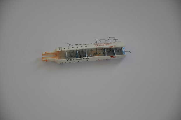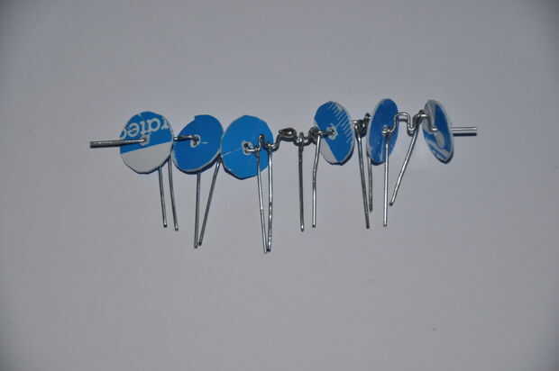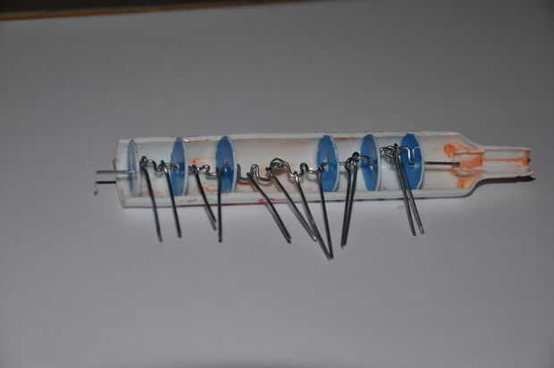 Con un objeto punzante (en mi caso un destornillador fino) hacer una derecha del agujero en el centro de cada círculo. A continuación se hace una incisión desde el borde a la paloma de cada ciclo. Estos círculos están ahora a través de esas rendijas empujados en el cigüeñal entre los diferentes pares de manivelas. Asegúrese de que todas las cañas se colocan bien! (cada barra de una manivela)