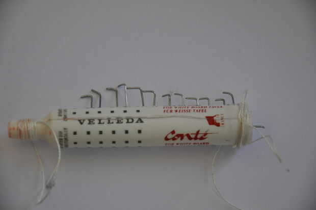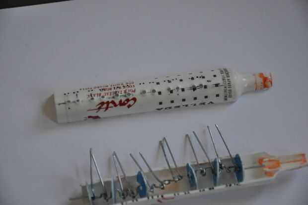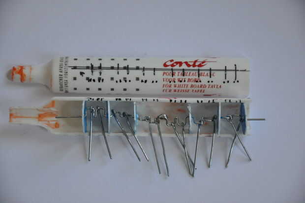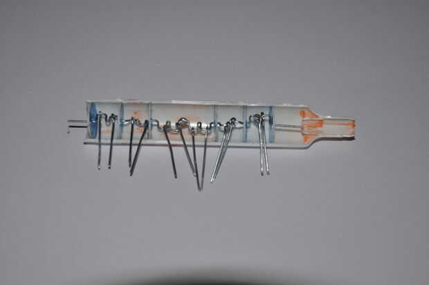 Todas las barras son empujadas cuidadosamente en sus orificios para que la parte superior e inferior del marcador vienen juntos.