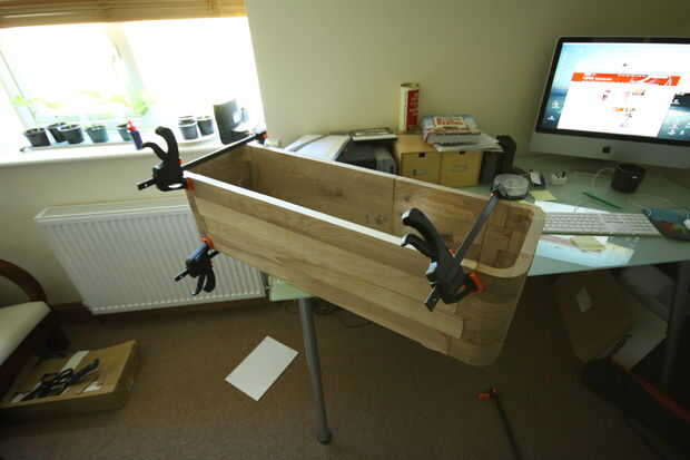 Para completar la parte superior, necesita el cuenco con las secciones del 2 extremo de la parte superior del marco. Me pareció más fácil de fijar la sección corta primero con las pinzas y luego puse la sección superior y la cubeta con la sección más corta ahora atada sobre una superficie plana. Si tiene el mismo tamaño de abrazaderas que usé te encontrarás que no hay nada que agarre para sujetar los componentes juntos mientras secado, así que viraron un par de cuadras a cada lado de la Junta a proporcionar de compra.