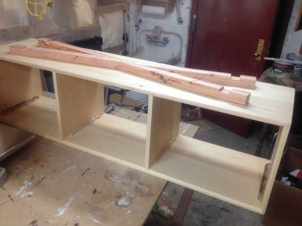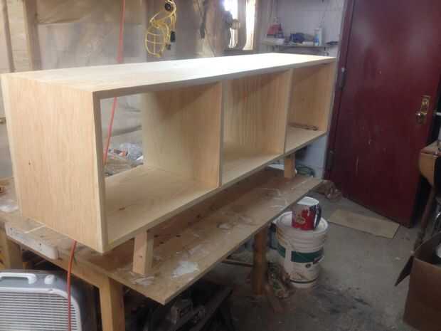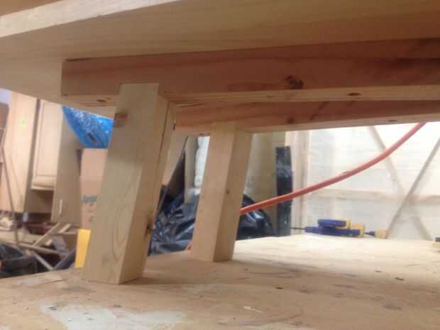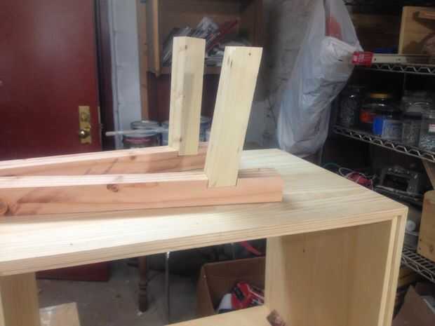Corto (4) de 7 pulgadas de piernas en un ángulo de 8 grados en los extremos también. Coloqué las piernas en los surcos que fueron cortados previamente para asegurarse de que el ajuste era seguro. Luego perforé tornillos en 3 en la parte superior del marco hacia abajo en las piernas. Una vez que las piernas fueron instaladas en el marco de la pierna, aseguró en la parte inferior de la pieza más grande con tornillos.
