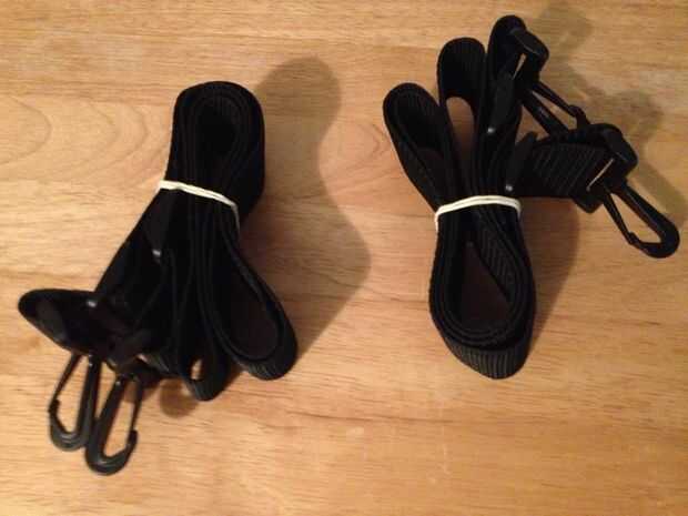 2. dos correas de nylon con clips de plástico duros en cada extremo, las correas en la foto, compró a Wal-Mart, son 6 pies de largo y eran demasiado cortas para mi estatura 5' 8". Usted debe medir la longitud de la parte delantera de su cintura, hasta sobre su torso y hombros y luego por tu espalda en el centro de la parte posterior de la cintura. Incluso entonces debe calcular algún sobrante para el ajuste.