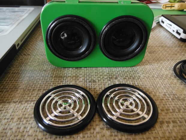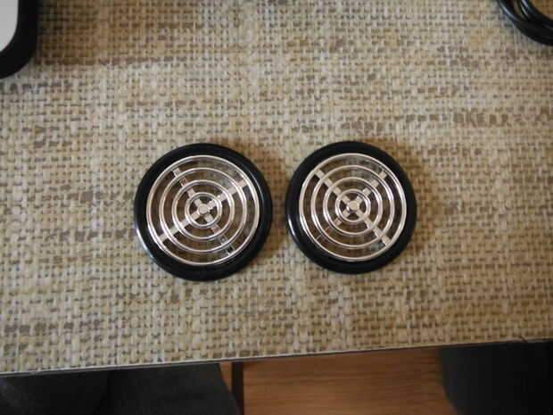Estos son opcionales, pero recomiendo tener algo para proteger los altavoces. He encontrado estas cubiertas de polvo que se muestran en un paso anterior en mi ferretería local y logró modificar para caber como rejillas de altavoz. Simplemente cortarlas un poco más pequeño y luego pegar una arandela de plomería alrededor de la parte exterior de cada rejilla. Luego epoxi pegado al borde de los altavoces, teniendo cuidado de no tener pegamento en el cono.