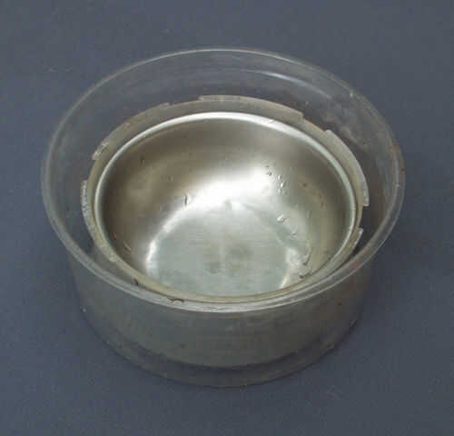 A partir de la taza de acero inoxidable para el atún, encontré que cabe perfectamente dentro del envase plástico que CDs vienen en. Para el recipiente de alimentación que usas, puede que necesite encontrar un recipiente diferente a que se ajusta. Ese contenedor, a su vez, debe caber dentro de otro recipiente de plástico. Deje una distancia adecuada entre ellos para el foso de agua. El foso debe ser suficientemente ancha como que una hormiga no puede alcanzar a través de ella sin nada, que no suelen hacer.