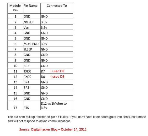 También usé un tablero de puente intermedio para hacer conexiones entre el TX del Arduino y RX del transceptor ANT +. Tuve que usar un divisor de tensión a paso de 5V (la salida de Arduino) a los 3, 3V (límite de la entrada de voltaje máximo de la señal de RX para el transmisor-receptor ANT +). El ANT + transmisor-receptor que utilicé fue la Dynastream ANTAP281M4IB en Digikey. Fue difícil para la soldadura y también las conexiones de puente correcto. Si algo nuevo hay en el mercado, me gustaría ir esta ruta la próxima vez. Recursos para el cableado correctamente el Dynastream fueron encontrados en la web en la siguiente URL: Blog de Digitalhack, sobre todo el comentario con respecto a la conexión del Pin 17 RTS. Las diferencias en mi cableado eran que TXD0 en el dynastream se conectó a D8 (RX) en el Arduino y que RXD0 en el dynastream se conectó a D9 (TX) en el Arduino. Otra hoja de datos en el Dynastream ANTAP281 están disponibles en la siguiente URL: hoja de datos de ANT +. La descripción de la conexión para todas las ubicaciones pinout 17 son descritos anteriormente (la versión que utilicé fue la versión de montaje superficial de este transceptor ANT +). Tenga en cuenta que en el método que cubrió a la Dynastream, la tasa de baudios para comunicar que es 4800 baudios. Necesitamos el código de Arduino para reflejar esto.