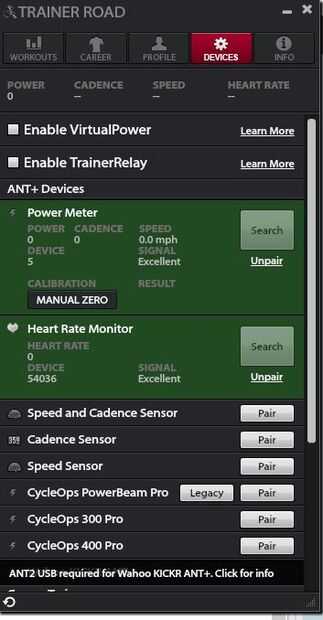 Algunos de los enlaces anteriormente presentados pasan por depuración de métodos para asegurar que el ANT + transceptor está trabajando así que no tocaré en este. Mi interés es utilizar el trainer de Cateye con PC basado en software. He encontrado Traineroad a ser un excelente programa, sobre todo porque puede especificar intervalos de entrenamiento con el tiempo y la potencia deseada. Las capturas de pantalla por encima de espectáculo configuración Trainerroad para el medidor de energía hemos creado por esta configuración de hardware y software, así como conexión a un ANT + pulsómetro. El dispositivo de medidor de energía también recopila la información de la cadencia de nuestro sistema. Los gráficos de pantalla muestran los datos enviados desde el 1987 que Cateye Ergosiser es leída correctamente por el sistema de Traineroad!