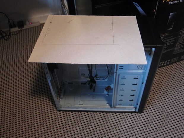 Para comenzar, toma una hoja delgada de cartón y cortarlo para que se ajuste en su caso. Luego se mide el ancho de la caja. (mina era de unos 20 cm) Desea inspeccionar el interior de su caso y encontrar el mejor lugar para las manijas. Asegúrese de que no hay piezas que bloquean el acceso a la instalación de la manija. Si sólo desea una manija, asegúrese de que se coloca en un lugar donde el caso está equilibrado con todos los componentes instalados.