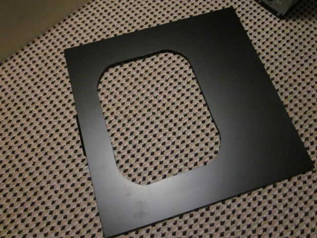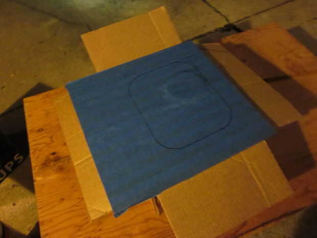 Encontrar un puesto de trabajo adecuado y conseguir sus manos en una caja de cartón ligeramente más pequeño que su panel. Luego coloque el panel encima de la caja (abrir el cuadro) y prueba para asegurarse de que el panel será estable. Me parece que la manera más fácil de cortar por la ventana, como la caja apoyará el panel de todos los bordes, mientras que nos da un área abierta para cortar la ventana. (Pro tip: poner algo dentro de la caja que dará soporte a la ventana durante el corte.)