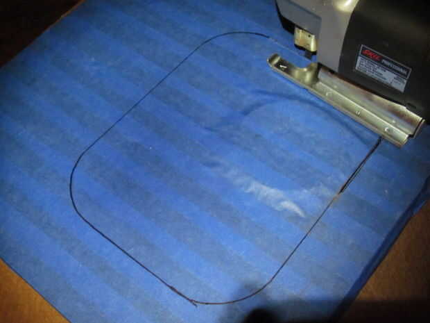 Ahora es el momento para sacar su dremel confianza y comience el corte. Te recomiendo que uses un disco de corte de fibra de carbono, pero creo que podría trabajar cualquier disco de corte para este truco. Mediante el corte de la dremel un una ranura pequeña a lo largo de su línea, esto nos dará un lugar para poner el juego y empezar a cortar, si no tienes una dremel, te recomiendo conseguir uno, pero por el momento, puede utilizar un taladro con una broca grande y perfore un agujero en alguna parte a lo largo de la línea (en una curva tal vez) para empezar , (Punta pro: Si usted no quiere cualquier esquinas curvas, asegúrese de realizar primero una partida ranura en cada lado de la ventana.)