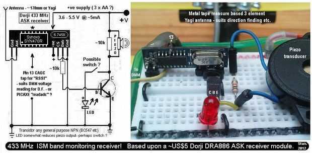 recibió audio ser tanto visto y oído. Aunque el LED puede ser difícil de ver al aire libre y el piezo difícil escuchar, esto es particularmente valioso cuando identificar una transmisión de señal y su específica "programa"! En las zonas urbanas la banda ISM de 433 MHz libre de licencia local puede estar llena de extrañas transmisiones derivadas de puertas de garaje, mandos de coches, estaciones meteorológicas de patio trasero y energía inalámbrica monitores etc..