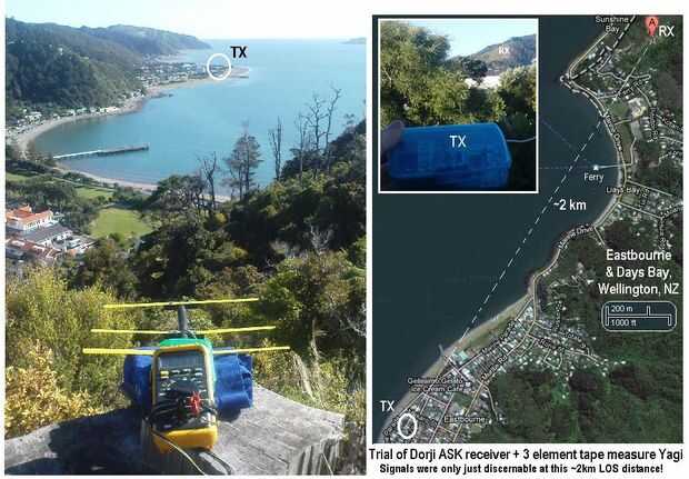 Para verificar el alcance previsto un enlace de LOS cercano de 2km fue investigado. Aunque las señales fueron recibidas por un escáner de frecuencia ultraelevada (incluso con sólo su caucho ducky antena), la detección fue en el límite mismo de la Dorji DMM/cinta métrica sistema Yagi. Incluso con un 4 º elemento de la antena del transmisor distante de ~ 2km era discernible (cuestionable) en el metro sobre las lecturas de ruido de fondo (significativo).