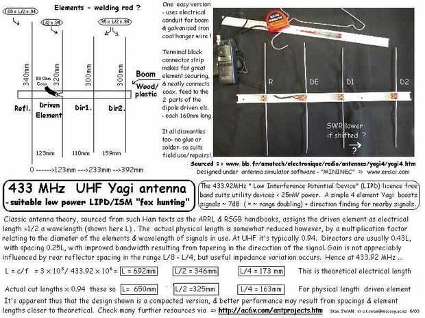 Yagi simple diseños siguen técnicas larga "dipolo de media onda", a menudo utilizando hardware imaginativo - este "Cotanga" (percha!) basado en 433 MHz diseño previamente ha demostrado ser un artista bueno, ofreciendo quizás 6dB (= duplicación de gama) ganar sobre una antena isotrópica. Sin embargo los elementos de alambre rígida no adaptan fácil almacenamiento o despliegue rápido, y pueden ser un peligro ojo de cerca...