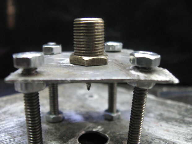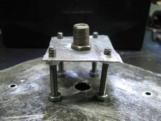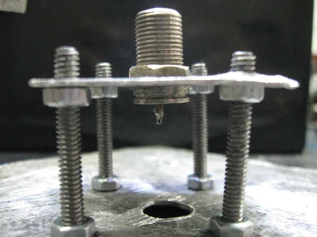 Ahora como nuestra base principal de la antena ha sido finalizado, es hora de poner la toma de antena en su posición. Ahora llevar en el pequeña corte de la placa de aluminio y fijar en los pernos que sobresalgan, como se muestra en la figura. Esto funciona como un accesorio firme para sostener la toma de antena en su lugar firmemente.