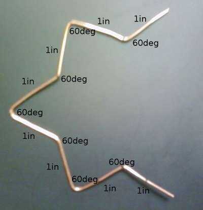 A repetir este paso para cada cable. Cada curva del cable será 60 grados exactamente como vamos a hacer triángulos equiláteros con este fractal. He utilizado dos pares de alicates y un transportador. Cada curva se hará en las marcas 1. Asegúrese de que se visualice la dirección de cada curva antes de lo que es! Utilice el diagrama de abajo.