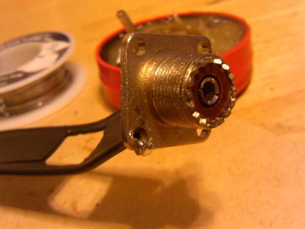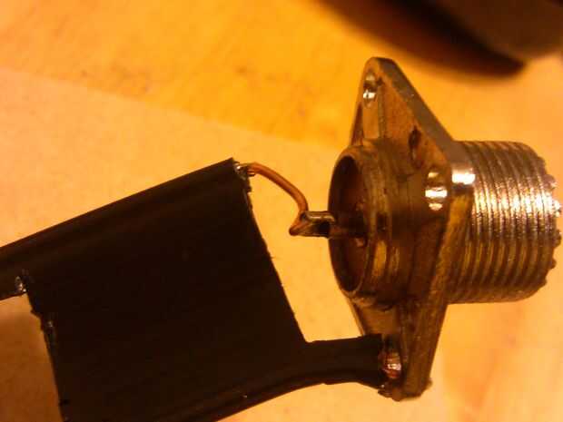 Usted tendrá que soldar el coaxial al otro extremo de la línea de escalera. La imagen en el enlace de arriba muestra el cable coaxial directamente soldado a la línea de la escalera. Opté por usar un conector UHF SO239 de la caja de la chatarra. Usted también puede comprar estos de Radio Shack o en ebay a veces.