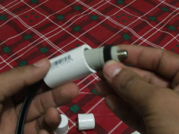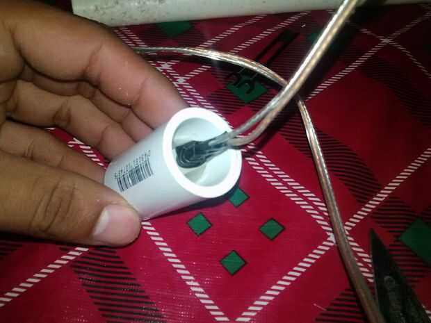 -ya terminado, metemos el cable y el transformador en el cople de pvc y aseguramos con el anillo.