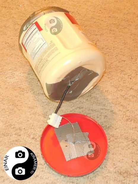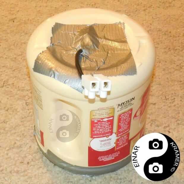 Puse unos trozos de cartón entre la tapa y la lata para obtener una distancia uniforme y graba todo. Ahora está listo para cable coaxial.