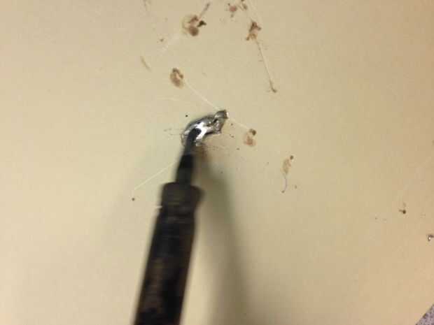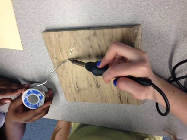 Nota: Amelia y yo intentado la soldadura en el papel, dando por resultado el aspecto quemado. Antes de instalarse en plexiglás, se intentó la soldadura en la madera, cinta pato y carpeta manila. La soldadura no fue capaz de pegarse a estas superficies.
