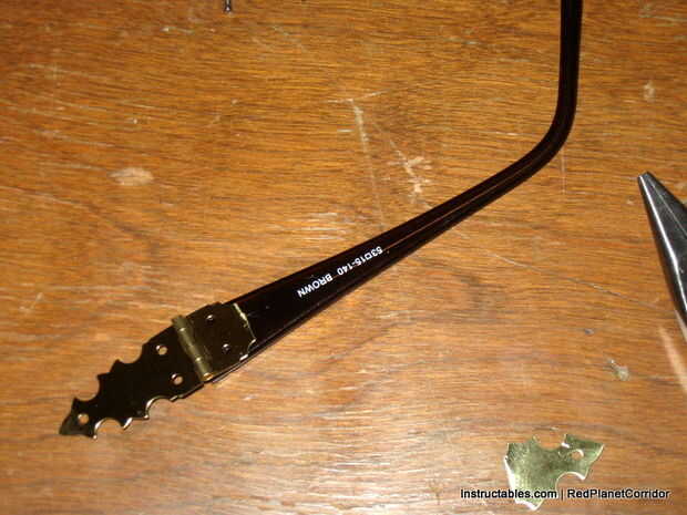 Después de cortar la longitud en ambos extremos de la nueva bisagra, comencé a doblar el lado de la bisagra que se adjunta al lado de la lente de los marcos. El plástico tenía una curva que necesitaba para que coincida con la bisagra nueva así que el pegamento que tendría suficiente superficie de contacto.