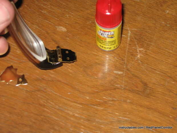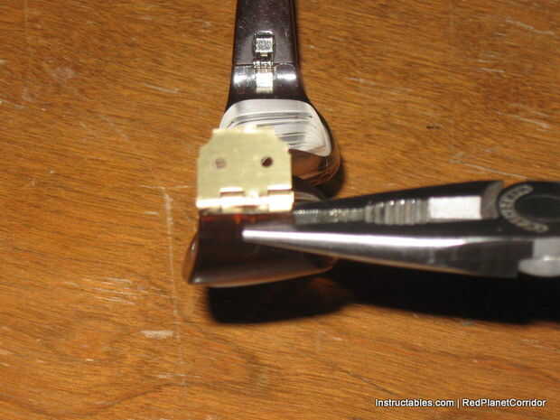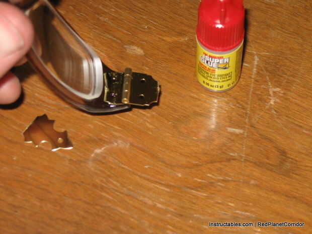 Como un soldador, me gusta el siguiente método para unir dos piezas juntas: 1) sostenga las piezas con alicates, 2) "virar" en uno o dos puntos y continúan manteniendo las piezas hasta que las "tachuelas" seco (15 segundos para el estupendo-pegamento), 3) quitar pinzas y unir las piezas enteramente. El pegamento original (no gel) tiende a mecha muy bien en los boquetes pequeños entre las piezas a pegar y yo también hicieron uso de los agujeros que ya estaban en las bisagras como otro lugar de la cola.
