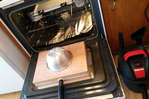 Configurar su vacío al lado del horno a su alcance. Bien Coloque la manguera en el agujero de la caja. Para un sello más apretado, coloque un anillo de masilla de Museo alrededor del borde de la manguera.