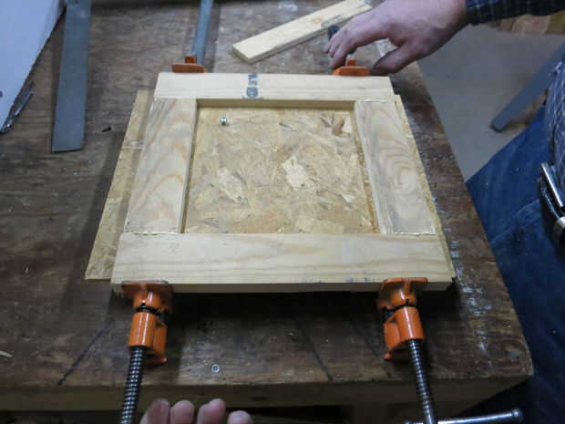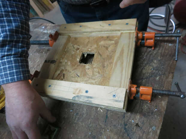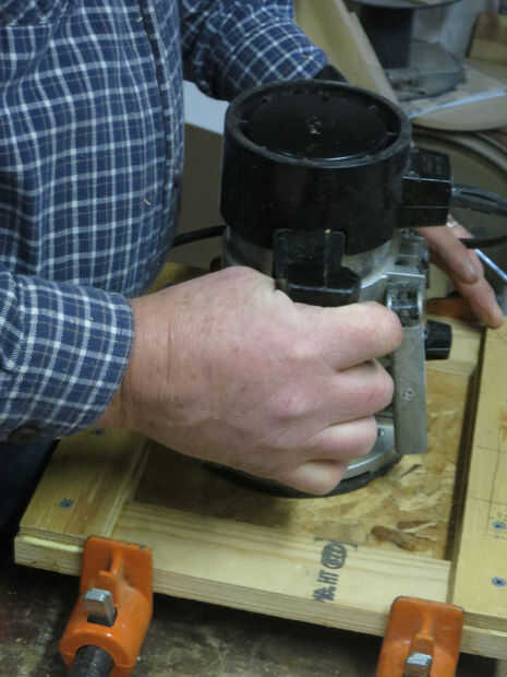 Los ejes fueron 1-3/4 "x 1-3/4" y los azulejos son de 2 "x 2" por lo que necesitábamos para agrandar los agujeros. Iniciamos este proyecto haciendo una plantilla para que podríamos cortar 16 cuadrados idénticos en las ubicaciones correctas después quitamos 8 husos. Hemos construido la forma usando madera tamaño cuidadosamente para que un router con 1/4" bits funcionaría dentro de la forma y crear el orificio correcto para los azulejos. Probamos esto en un pedazo de 1/4 tablero de partícula que se convirtió en una plantilla para alinear la plantilla en los orificios del eje. Seguridad en primer lugar, en cualquier momento utilizamos herramientas eléctricas o el cincel, llevaba gafas de seguridad.