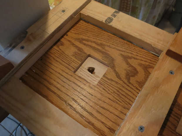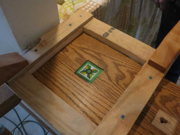 Cada huso había instalado con un tornillo perforado en el centro en la parte superior e inferior. Sierra de la caladora corte a través de los tornillos de la parte inferior y los tornillos de arriba fueron rotas de los husos; perforar un agujero de 3/8" a lo largo de los tornillos y utiliza alicates para quitar la parte de los tornillos todavía incrustados en las tablas de ajuste superior e inferior. Los orificios restantes en el centro de la Plaza no sería un problema cuando instalamos los azulejos decorativos.