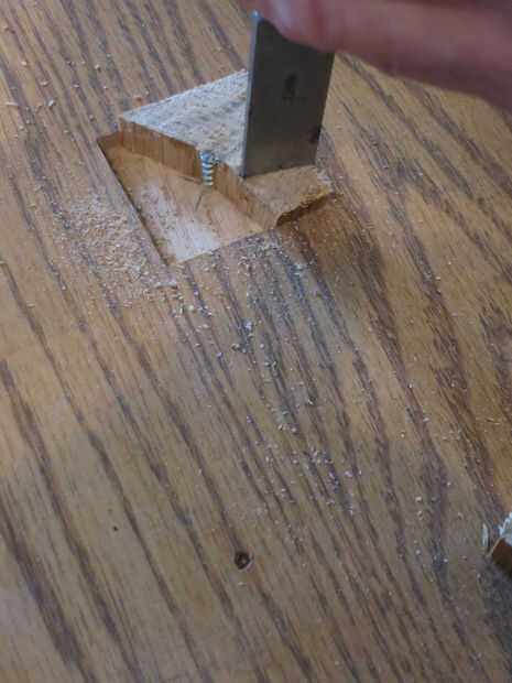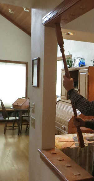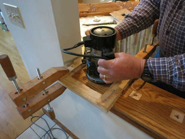 Colocamos cinta en el guarnecido del roble para protegerla de arañazos, luego con una sierra reciprocante con una hoja larga, cortamos a través de los fondos de cada huso. Los husos se pudieran quitar una vez que se cortaron tirando hacia abajo sobre ellos. Con los ejes quitados, usamos un martillo y cincel para eliminar la porción restante de cada huso.