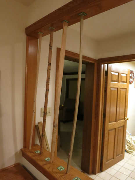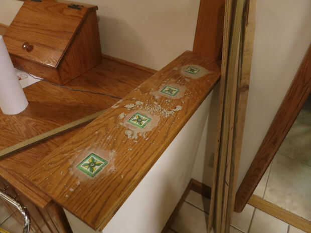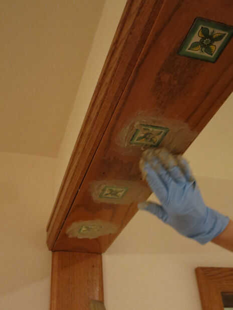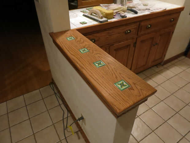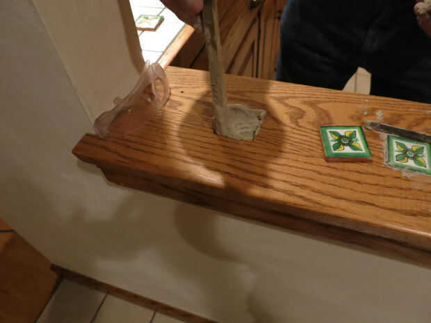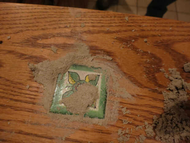 Antes de instalar la boquilla y azulejos, poner una ligera capa de barniz en cada uno de los 16 cuadrados y deje que se seque completamente durante la noche. Los azulejos superiores se ajustaron en su lugar y adornados con lechada. La resina de 5 minutos configura rápidamente, así que mezclamos sólo suficiente epoxi para instalar cuatro de las tejas arriba, seguidas por un segundo lote de los restantes cuatro azulejos arriba. Para evitar que las baldosas caigan mientras el epoxi, cortar palos y les sostiene en su lugar durante unos 20 minutos. Aplicamos la lechada después de que se eliminaron los apoyos.