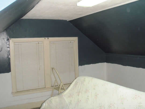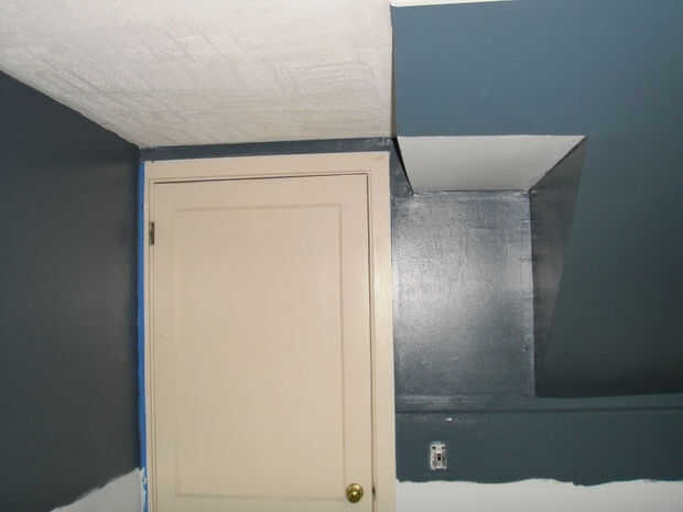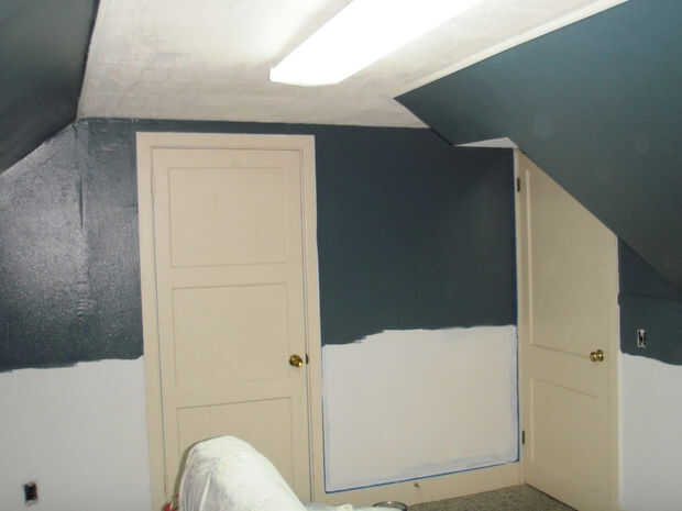 Nos con cinta de ajuste alrededor de las puertas así que no conseguir pintura en él. Ahora era el momento de empezar a pintar! Empecé con el azul, nos recortan a los bordes a lo largo de la obra de madera y techo de madera con una brocha primero. Entonces comenzó a trabajar rodando desde el techo hacia nuestra marca. No tiene que ser perfecto ya que se va a poner la moldura en, pero intenté conseguir como cerca de la marca posible. Luego pintamos el blanco en la parte inferior. Nosotros también pintar las puertas, ventanas y placas de base semi-gloss blanco para que coincida con el resto de la habitación. Que la crema realmente no ir!