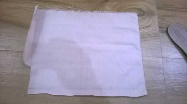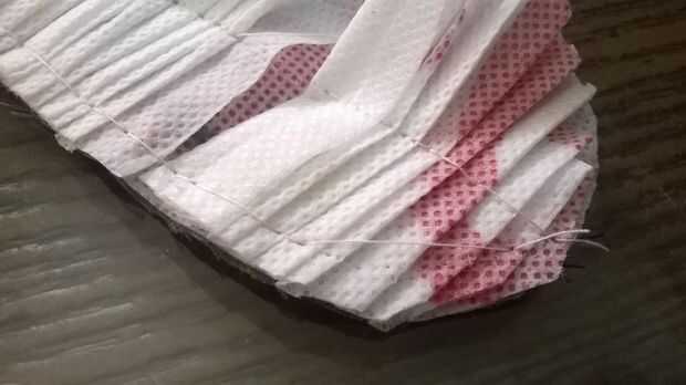 Ahora tome un pedazo de la tela de algodón y corte un rectángulo cuyo ancho debe ser un poco más de la planta del pie y la longitud deben ser el doble. A partir del talón se iniciará puntadas en la base de la planta del pie hecha de paño de nylon liso. A partir de 1 pliegue insertaremos nuestra corte espuma salidas. Entonces, después de cada doblez de 5-6 insertaremos los repetidamente.