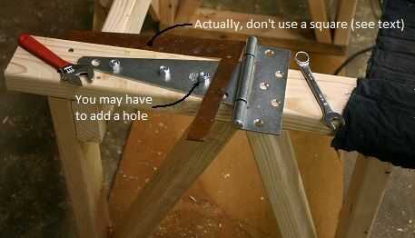 (Tenga en cuenta que mientras que en la foto, muestro una plaza... Terminé no usando uno. No funciona muy bien y sería excesivamente precisa si lo hiciera... la demanda de precisión en el montaje de la bisagra es bastante débil; No sweat lo.) - Abrazadera de la bisagra en posición y perforar los agujeros de la bisagra en la base.