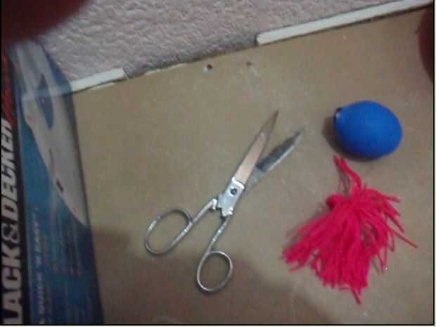 7. Fije el "pelo" a la pelota enrollando la lana sobrante en la bola alrededor del "pelo" una vez que esté firmemente agarrada, hacer un nudo apretado y cortar el exceso de lana.