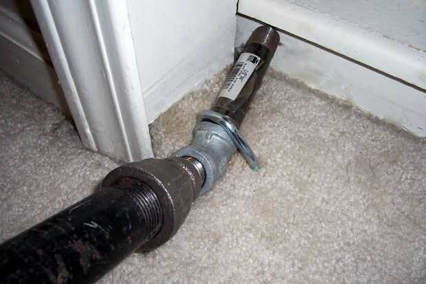 Un ojal de acero con rosca madera se utiliza para anclar el extremo del tubo.  El ojete estaba "abierto-para arriba" para crear un gancho.  Fue perforado un agujero piloto a través de la alfombra y en el subsuelo.