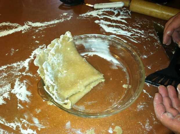 - Para mover formado masa para pie-pan, utilice cuchillo grande, recto para separar masa de contador como se muestra. Usando espátulas, doble la masa en la mitad y luego la mitad otra vez y colocar en la tartera. Se despliegan.