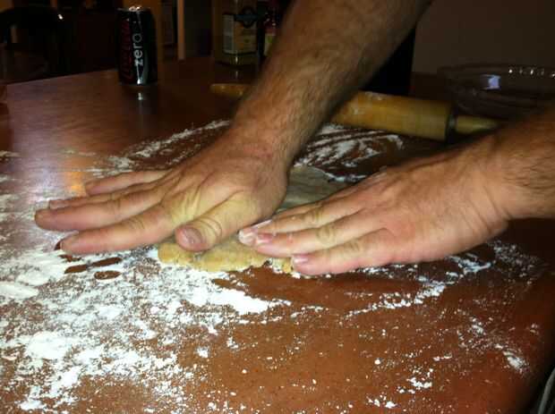 - Mientras que la corteza de la parte inferior está en el horno, estirar la otra bola de masa de la corteza superior. Doblar como antes para poner en pie.
