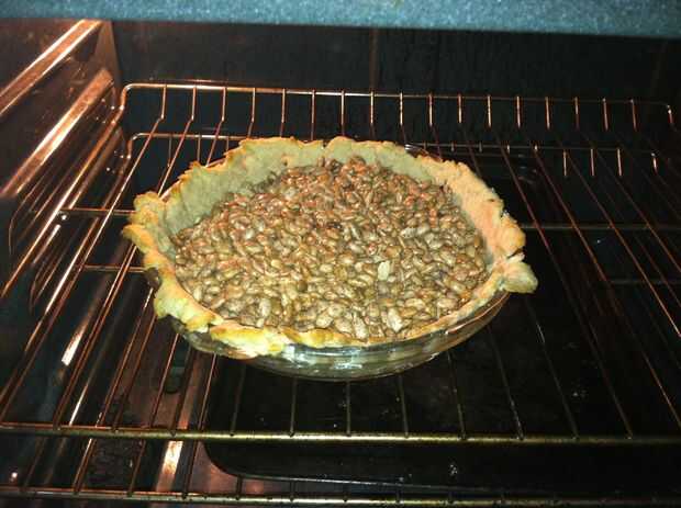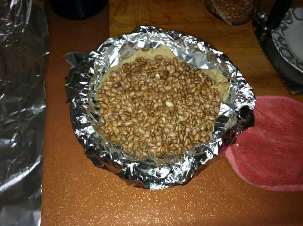 - Este paso es opcional, pero te vas a arrepentir no hacerlo. Después de 10 minutos, retire del horno la corteza y corteza relleno con frijoles secos. Los granos peso de la corteza hacia abajo y evitar que la corteza de ser deformado. Otra opción más simplista, es utilizar una tartera duplicados, vacía en lugar de los granos.