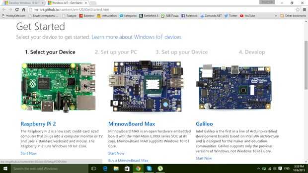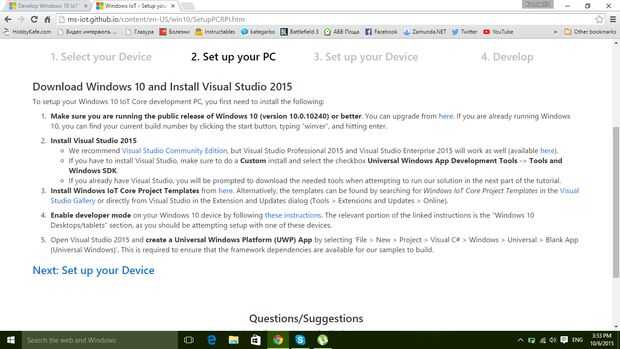 En primer lugar haga clic aquí y Descargar Visual Studio 2015 e instalarlo en tú ordenador. Después de instalar plantillas de proyecto de IoT de Windows desde aquí. Luego activar el modo Desarrollador en su dispositivo de Windows 10 siguientes estas instrucciones. La porción relevante de las instrucciones vinculadas es la sección "Windows 10 ordenadores de sobremesa y tabletas", como usted debe intentar configuración con uno de estos dispositivos.