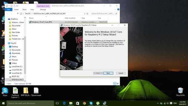 Descargar base de IoT de aquí, luego abrirlo e iniciar el archivo de instalación que lleva - Windows_10_IoT_Core_RPi2 y haga clic en siguiente. Le preguntará dónde instalar (por defecto - volumen C:/Program Files(x86) y Microsoft IoT) se puede instalar en cualquier lugar que desee.