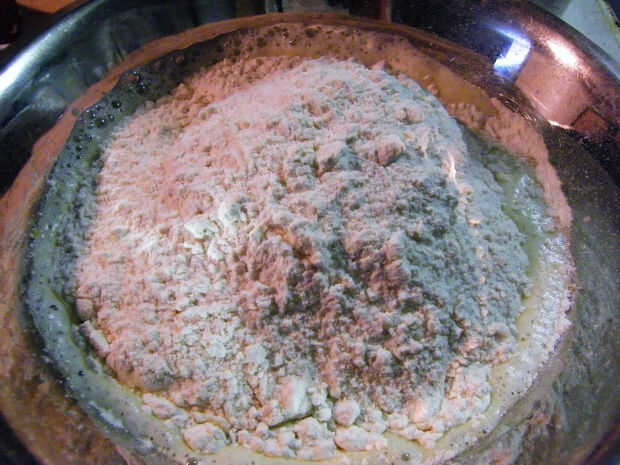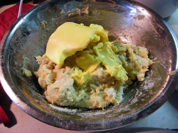 Amase en la margarina en la masa. En este punto, se sentirá masa pegajosa y húmeda.