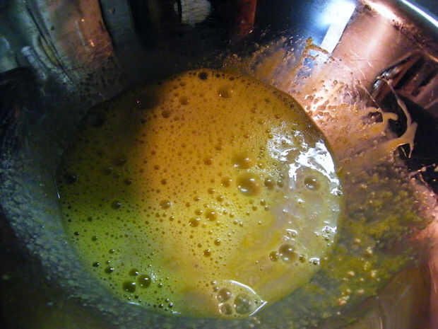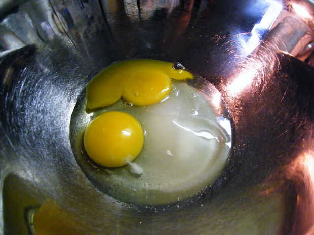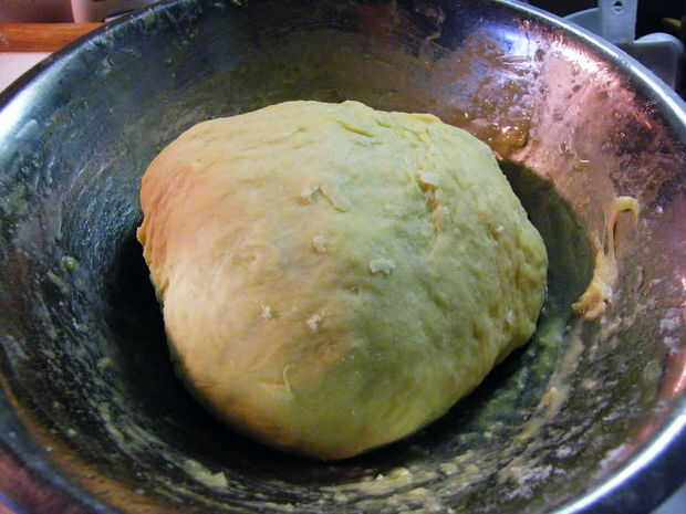 Batir los huevos y el azúcar durante un minuto, luego Vierta en la mezcla de levadura. Golpe de 1/2 minuto largo, verter en la leche, batir, luego agregar 3 1/2 c de harina de pan, amasar.