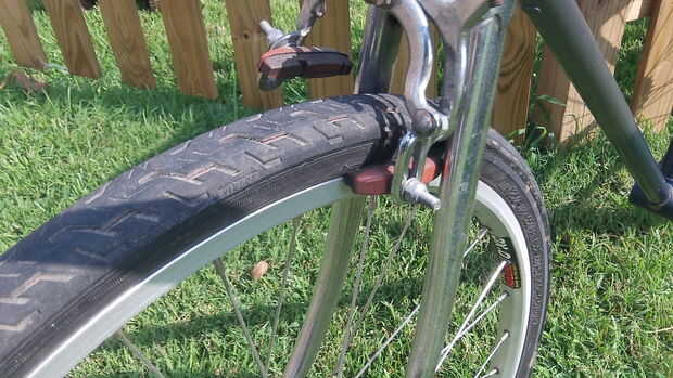 Una nota sobre tamaños de rueda: estoy usando un conjunto de ruedas de bicicleta de montaña 26" en un marco diseñado para 27" ruedas de carretera. Los frenos de largo alcance que se muestra a continuación se llega a un conjunto de ruedas de 700C de la población de lugar de instalación, pero no tenía otro "repuesto" juego de ruedas 700c ahí. Sin embargo, tenía un conjunto de ruedas de bicicleta de montaña. Esta bicicleta se utiliza principalmente para un entrenador para no tener que meterse con tomar mi bici favorita fuera el entrenador cada vez que quiero ir para un paseo en el mundo real. Las ruedas más pequeñas el soporte inferior de la gota y aumentan el riesgo de golpear un pedal en el suelo durante un turno. Si monta un conjunto de ruedas más pequeñas, siempre ten en cuenta esto al hacer vueltas.
