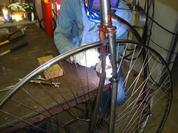 bifurcación de la bicicleta vieja. Soldar el tubo de extensión en la horquilla dura como usted sostenga en su lugar