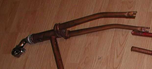 la columna vertebral. Estos 2 tubos que se cortan de la moto antigua se reutilizan para ampliar la horquilla delantera.