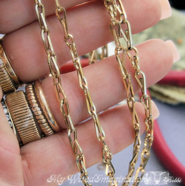 Alambre duro - 1/2 cuadrado o redondo - alambre recto 1 1/16 de pulgada por enlace - 3 enlaces por pulgada acabado cadena. Casi cualquier cable de calibre puede ser utilizado, sólo tener en cuenta el mayor calibre, más difícil son los enlaces, y la mayor probabilidad de caída de los dedos