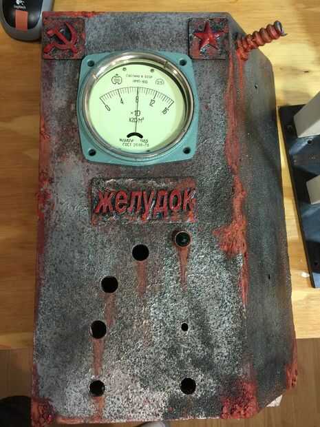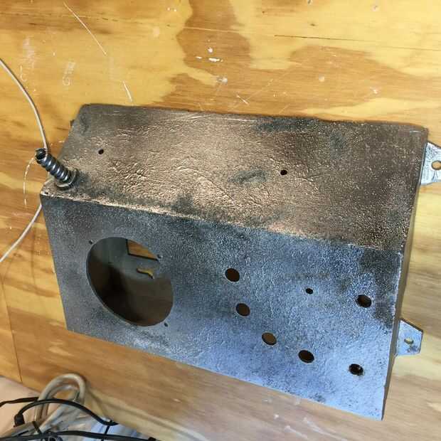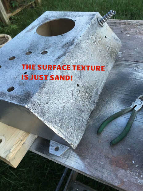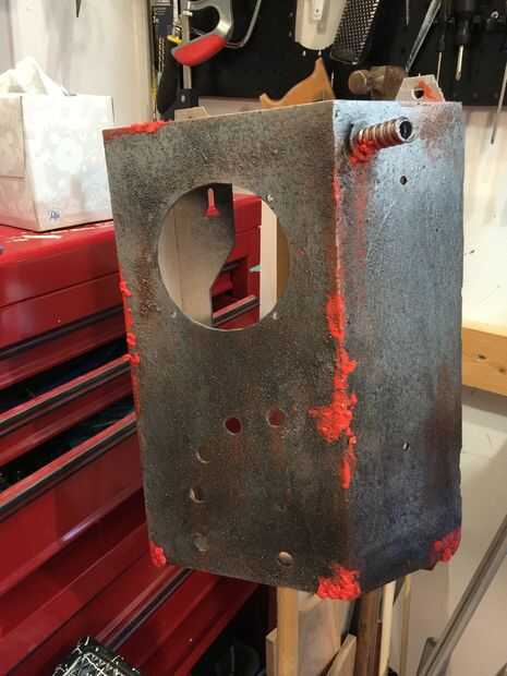 Los bordes de la caja se rellenaron para ocultar las juntas. el cuadro entero entonces fue dado dos capas de imprimación. No tengo ninguna pintura spray pero se me ocurrió algo tan bueno: mientras que la cartilla estaba todavía húmeda, salpicado de arena en la pintura! Después de un par manos manchadas de pintura en aerosol metálica plata, está listo para óxido. El video sugerido utilizar pintura roja y avena para las partes "herrumbre escamosa". He añadido un otro ingrediente a esa mezcla: blanco pegamento. Como se mencionó en el video, pintura y harina de avena pueden ser algo delicados después de que se seque, pero añadiendo un simple pegamento blanco a la mezcla se convirtió en una "escultura" mucho más sólida cuando se seca. Después de varias aplicación estratégica de lavado marrón, rojo y negro, tenía una mirada auténtica!