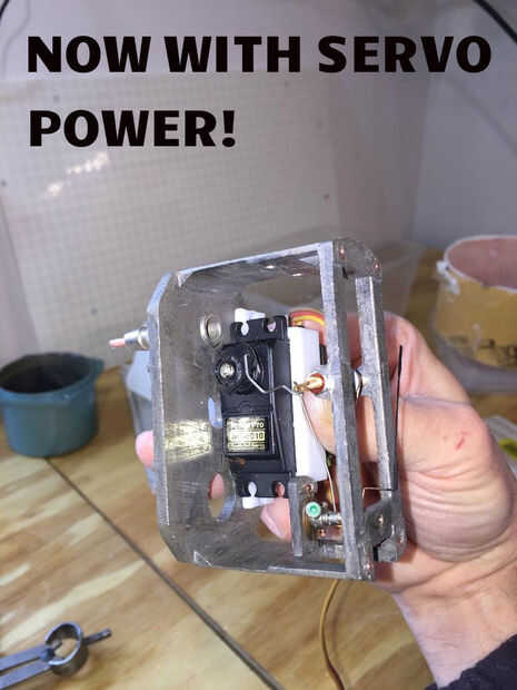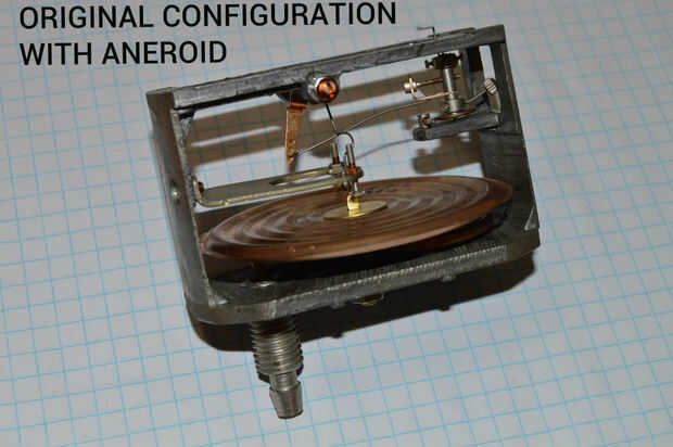 El calibre fue comprado por ebay, viene de una ex República Soviética (que olvidé). Lo compré barato, sin saber lo que funciona, puramente porque parecía elegante y misterioso, con letras extrañas en él. Cuando finalmente me lo puse me di cuenta de que era algún tipo de calibrador de presión; la parte trasera tenía dos puertos que realmente fueron etiquetados con un "+" y un "-", y podría hacer a la aguja completamente desviar por literalmente sopla en el puerto "+"! Llegué a la conclusión de que mide variaciones de presión de aire de un grado relativamente de menor importancia. El dial también brillaba en la oscuridad, otro bono. Realmente quería ser funcional hasta el punto donde se movería en respuesta al estado de los interruptores en la parte delantera. Primero traté de conectar el puerto "+" a un bulbo de squeeze simple Turquía baster con una manguera de goma, y aunque efectivamente trabajadas para activar el needle(!), no era un arreglo lo suficientemente bueno para una solución permanente. A regañadientes y con cuidado saqué el medidor aparte, y como sospechaba, el corazón de la galga era un aneroide, un fuelle metálico flexible, que literalmente expandido o se contrajo en respuesta a cambios en la presión atmosférica. Al final acabé quitando el aneroide y en su lugar os adjunto un servo hobby. Los originales vínculos mecánicos conectados a la palanca reciprocante del servo bastante bien, todo lo que tenía que hacer realmente era hacer un corto conector de alambre del resorte.