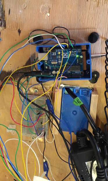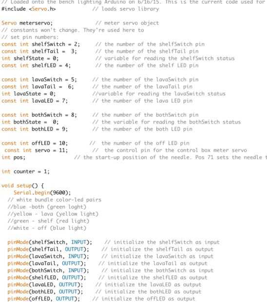 El Arduino es lo que hace todo el trabajo. Aunque hubo técnicamente suficiente espacio dentro de la caja para sostener el Arduino, experiencia me había enseñado no intentar meter cosas en un espacio tan reducido, a menos que sea absolutamente necesario. Finalmente había montado el Arduino detrás un asiento cercano y había conectado todos los cables necesarios detrás de la pared. En la foto el Arduino es en una caja eléctrica con un protoboard por debajo de ella. El Arduino escurr el bosquejo disponible aquí. Como se mencionó en el paso de "interruptores", utilizando el Arduino como el cerebro central permite máxima flexibilidad. Las luces indicadoras, relés y calibre son controlados por el microcontrolador.