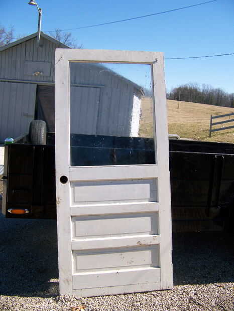 Esta es la puerta que fue elegida para ser la mesa. Tiene tres inserciones debajo de la ventana que son buenos lugares para poner más fotos y recuerdos en tu mesa "shadowbox". En primer lugar, tomé afuera en un día precioso y limpia con un jabón de plato y cepillo de cerdas suaves matorrales. Usé una manguera para lavar hacia abajo. No quería fregar la pintura, por lo que no frotar vigorosamente. Sólo quería bajar cualquier suciedad mayor. Limpieza spic y palmo iba a arruinar el aspecto para mí!